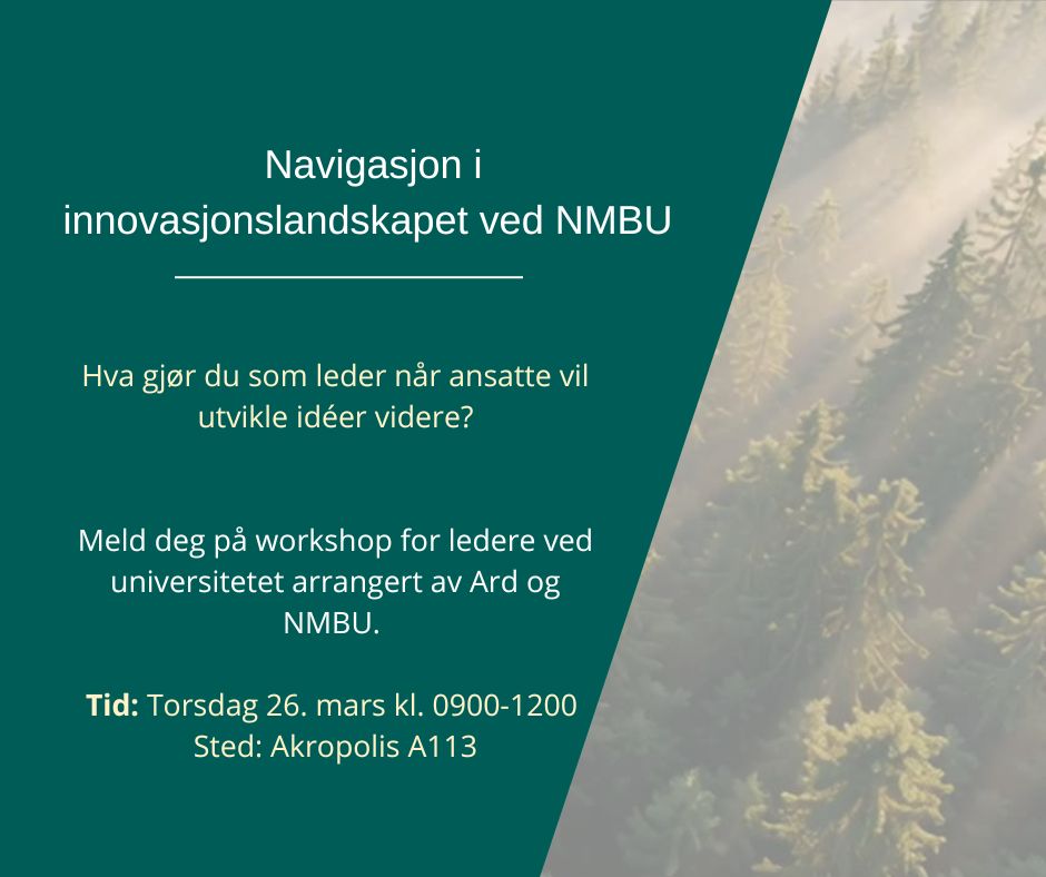 Som leder ved NMBU møter du før eller siden på ansatte som ønsker å utvikle idéer og resultater til tjenester og produkter. Kanskje er idéen tidlig og utydelig, kanskje er det modne resultater som krever hurtige avgjørelser. Hva gjør du da? Hvilke regler gjelder, hvilke virkemidler finnes, og når bør du koble på støtteapparatet?